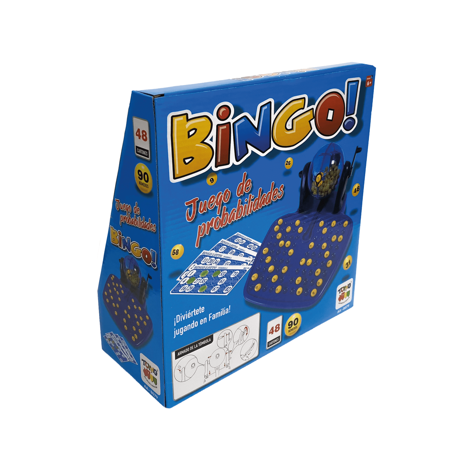 • Set completo: Incluye una tómbola giratoria, 90 números, 48 cartones y fichas, listo para empezar a jugar.