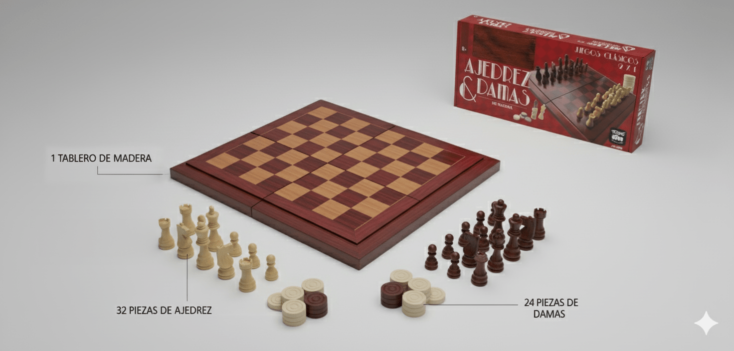 • Diseño 2 en 1: Incluye tablero reversible para jugar ajedrez y damas, optimizando el espacio y la funcionalidad.